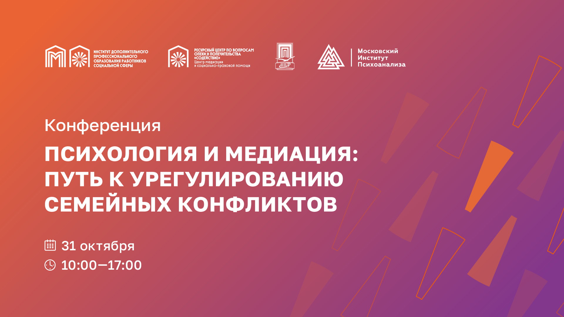 Мероприятие проводится филиалом «Центр медиации и социально-правовой помощи» ГБУ «Центр «Содействие» совместно с ГАУ «Институт дополнительного профессионального образования работников социальной сферы» ДТСЗН города Москвы и при поддержке Московского института психоанализа и Общероссийской профессиональной психотерапевтической лиги.